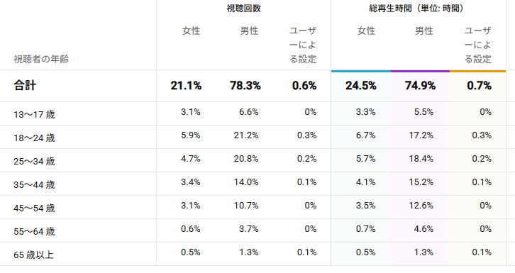 A: 当社のYoutubeチャンネルの動画視聴データが参考になるかと思います。Youtubeは12歳以下の利用ができないようになっていますが、親アカウントで見ている人が一定数以上いるので、実際は小学生のファンも多いようです。修学旅行先のお土産物屋さんなどでは若者にかなりグッズが売れています。